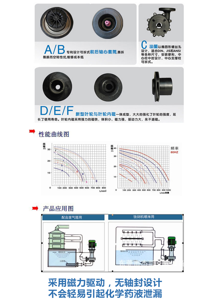 部分化學(xué)酸堿液輸送;葉輪和磁鐵一體注塑成型,在高速運(yùn)轉(zhuǎn)及高溫下不易損壞;全新流道設(shè)計(jì),使產(chǎn)品流量損失降低