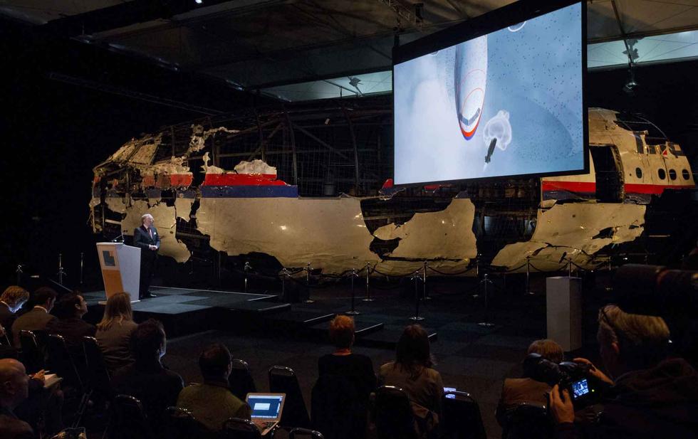 發(fā)布會現(xiàn)場,荷蘭調(diào)查人員展示了MH17航班前半截殘骸的重組。當(dāng)扭曲且布滿彈孔的客機殘骸出現(xiàn)在眼前時,現(xiàn)場媒體記者一片沉寂。