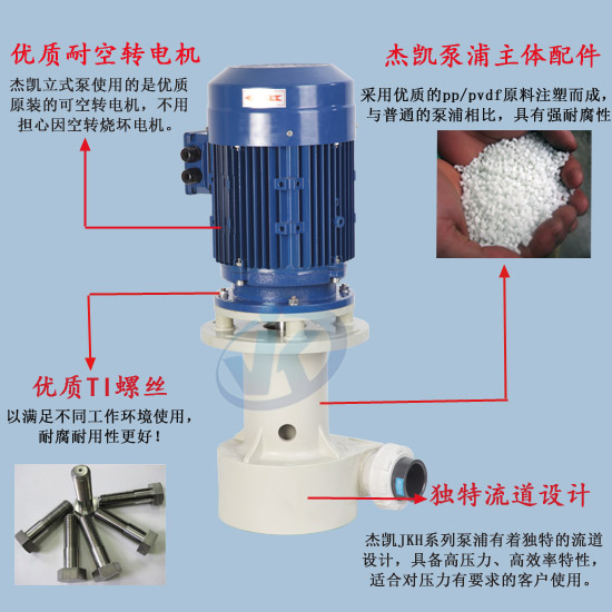 杰凱JKH 高壓耐酸堿立式泵 1-10HP使用范圍廣,適合各種酸堿液循環(huán)、冷卻、噴洗設(shè)備,廢氣塔、蝕刻機、化學(xué)鍍、無電解鎳等特殊場合;適合于槽內(nèi)安裝使用,可配合過濾機使用。