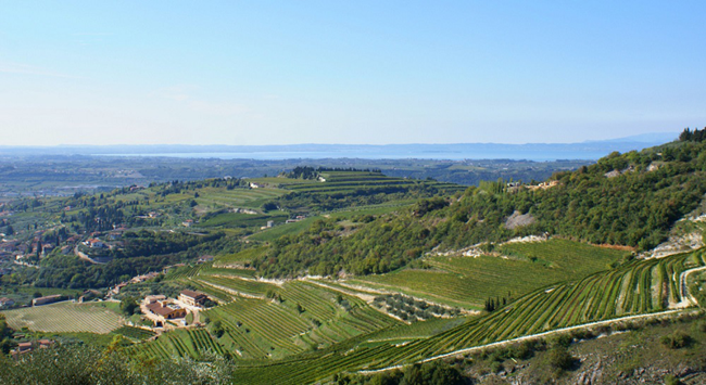 蘇瓦韋產(chǎn)區(qū)位于維羅納的東面,是意大利最著名的白葡萄酒產(chǎn)區(qū),于1968年被列為DOC產(chǎn)區(qū)。該產(chǎn)區(qū)擁有兩種不同的地形:北面的山麓和南面靠近波河的平原。蘇瓦韋的山麓地帶以石灰石和黏土為主,帶有些許火山巖石。葡萄園海拔較高,氣候涼爽,因此葡萄的生長(zhǎng)期較長(zhǎng),葡萄在完全成熟的同時(shí)還保持高酸度。這里出產(chǎn)的葡萄酒可以標(biāo)注為“經(jīng)典蘇瓦韋(Soave Classico)”。而平原地帶的葡萄園以沙土和沖積土為主,儲(chǔ)熱能力較好,加上附近的河流能夠反射陽(yáng)光,為葡萄園增加熱量,因此葡萄成熟較快,釀出的葡萄酒果味較濃,酸度中等,適合年輕時(shí)飲用。