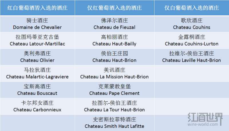 直到1953年,法國國家原產(chǎn)地命名管理局(Institut National des Appellations d'Origine,簡稱INAO)對格拉夫的紅葡萄酒進行評級,并擬定了一份非官方名單,共有13座酒莊入選。1959年,該分級制度在原來的基礎上新添了對格拉夫干白葡萄酒的評級。在最終公布的官方名單中,共有16座列級莊入選,其中紅、白葡萄酒均入選的有6座,僅紅葡萄酒入選的有7座,僅白葡萄酒入選的有3座。