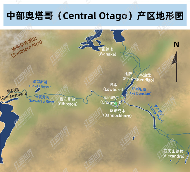 中部奧塔哥是世界上最南端的葡萄酒產(chǎn)區(qū),位于南阿爾卑斯山(Southern Alps)山腳下,葡萄園海拔大多為220至420米。產(chǎn)區(qū)總葡萄園面積為1,873公頃,種植有黑皮諾、灰皮諾(Pinot Gris)、雷司令(Riesling)、霞多麗(Chardonnay)和長相思(Sauvignon Blanc)等葡萄品種,葡萄酒產(chǎn)量僅占新西蘭總產(chǎn)量的3%。