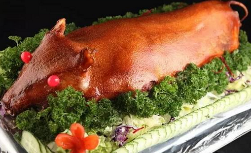 制作烤乳豬的時候先將內臟去掉,取香料腌制入味,再進行烤制,另外,豬皮含大量膠原蛋白,有養顏健膚功能。乳豬較瘦,脂肪含量少。色澤紅潤,光滑如鏡,皮脆肉嫩,香而不膩,讓你百吃不厭。