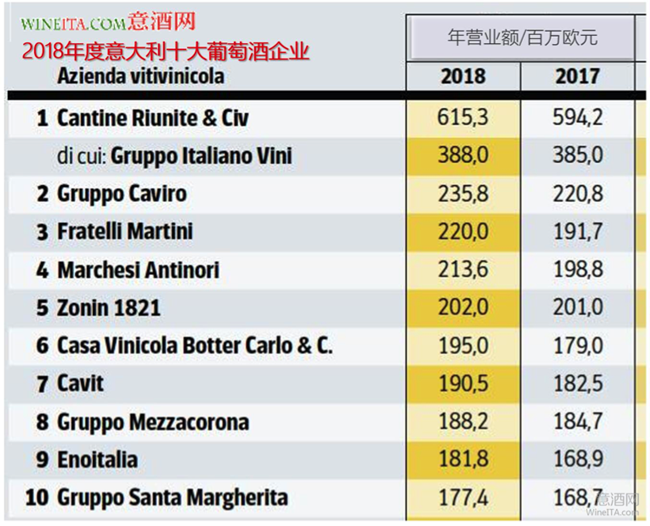 意大利雖然擁有超過10萬家酒莊,但是95%以上的酒莊年產(chǎn)量都在10萬瓶以下,即使是意大利排名前十大的企業(yè),除了GIV集團年產(chǎn)值超過3億歐元,其余9家的產(chǎn)值都在2.5億歐元以內(nèi)。意大利的前十大公司經(jīng)營規(guī)模和綜合實力,與法國(拉菲羅斯柴爾德和卡思黛樂集團年產(chǎn)值均超10億美元)、澳大利亞(2019年富邑20億美元產(chǎn)值)、智利(干露超過10億美元)、美國(嘉露超過30億美元)的大型酒業(yè)集團規(guī)模差距較大。從葡萄酒生產(chǎn)的規(guī)模衡量,和國際大型酒商相比,意大利葡萄酒產(chǎn)量最大的Caviro集團年產(chǎn)量也只能排在全球第15位。