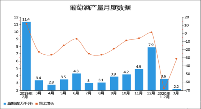 2020年3月全國(guó)葡萄酒產(chǎn)量為2.2萬(wàn)千升,累計(jì)值為5.8萬(wàn)千升,同比下降31.3%,累計(jì)下降40.8%。
