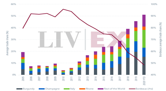 隨著市場(chǎng)繼續(xù)擴(kuò)大,波爾多的交易份額已跌至歷史新低的41%;勃艮第也跌至9.3%。 這進(jìn)一步證實(shí),買家的興趣已擴(kuò)展到這兩個(gè)高價(jià)值酒區(qū)之外。