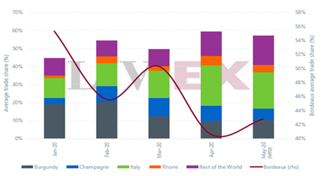 意大利成為了最耀眼的新星。上月,該酒區(qū)的交易份額升至22.5%的歷史新高;部分是由于免美國(guó)關(guān)稅、以及廣受好評(píng)的布魯諾Brunello ’15年和巴羅洛Barolo ’16的發(fā)布活動(dòng)所推動(dòng)。 羅納(5.2%)和“世界其它酒區(qū)”(13.3%)的交易份額也有增加。