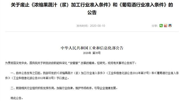 8月10日,中華人民共和國工業(yè)和信息化部發(fā)布公告,稱即日起廢除《濃縮果蔬汁(漿)加工行業(yè)準入條件》(工業(yè)和信息化部公告2011年第27號)和《葡萄酒行業(yè)準入條件》(工業(yè)和信息化部公告2012年第22號)。此外,鼓勵相關行業(yè)組織積極發(fā)揮作用,加強行業(yè)自律,維護市場秩序,引導企業(yè)健康發(fā)展。