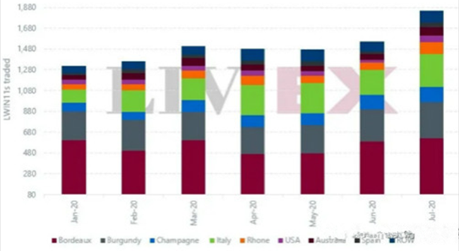 2020年上半年交易的獨(dú)立葡萄酒數(shù)量比2019年同期增長(zhǎng)了37%。下半年初更加強(qiáng)勁,7月份交易的獨(dú)立葡萄酒數(shù)量(LWIN7)更首次突破1,000;并比之前最高月份高出超過20%(如下所示)。