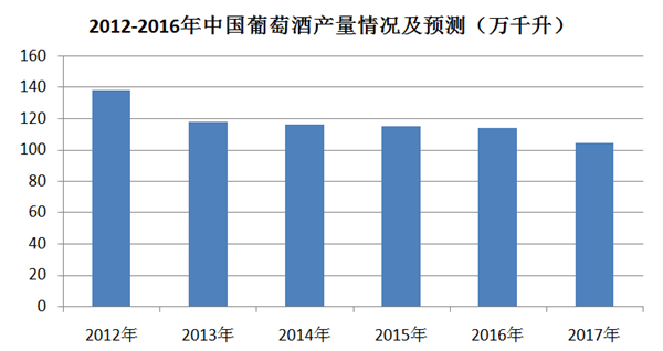 從近幾年我國葡萄酒的產量情況來看:2014-2017年以來我國葡萄酒呈逐年下滑態勢。2016年全國葡萄酒產量達113.7萬千升,同比下滑1%。2017年大幅下滑,產量為100.1萬千升,同比下滑12%。據中商產業研究院預測,預計2018年中國葡萄酒產量將下滑至97.8萬千升。