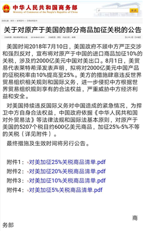 中國(guó)商務(wù)部新聞發(fā)言人就美國(guó)對(duì)160億美元中國(guó)產(chǎn)品征稅發(fā)表談話,并表示美方一意孤行,于8月23日在301調(diào)查項(xiàng)下對(duì)自中國(guó)進(jìn)口的160億美元產(chǎn)品加征25%關(guān)稅,明顯涉嫌違反世貿(mào)組織規(guī)則。對(duì)此,中方堅(jiān)決反對(duì),并不得不繼續(xù)作出必要回?fù)簟M瑫r(shí),為捍衛(wèi)自由貿(mào)易和多邊體制,捍衛(wèi)自身合法權(quán)益,中方將在世貿(mào)組織爭(zhēng)端解決機(jī)制項(xiàng)下就此征稅措施提起訴訟。