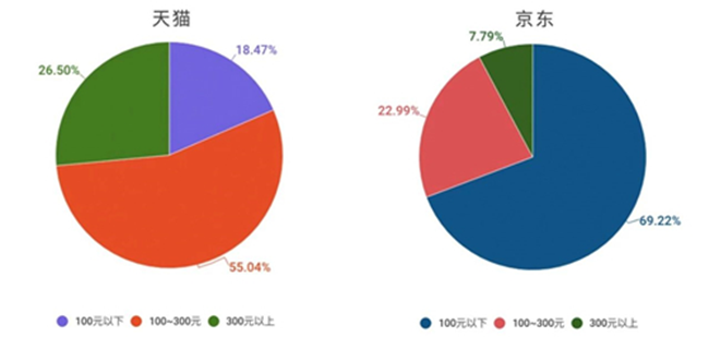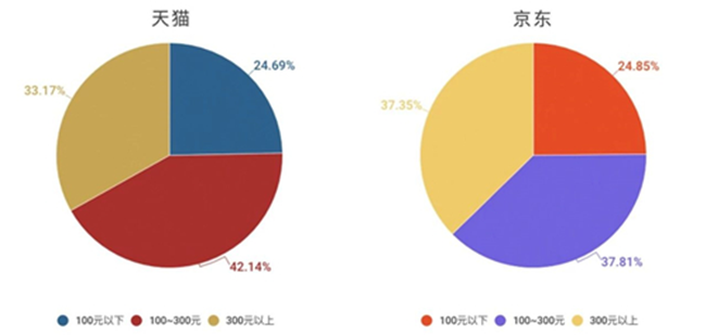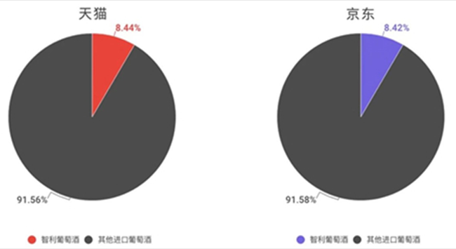 在天貓和京東兩大電商平臺(tái)上,智利葡萄酒的酒款數(shù)量占比均為8.4%,非常一致;此外,兩大平臺(tái)不同價(jià)位的智利葡萄酒分布也相對(duì)接近──低端智利酒的占比略低,而中高端的酒款數(shù)量比起意大利等競(jìng)爭(zhēng)對(duì)手來說則明顯占比更高。