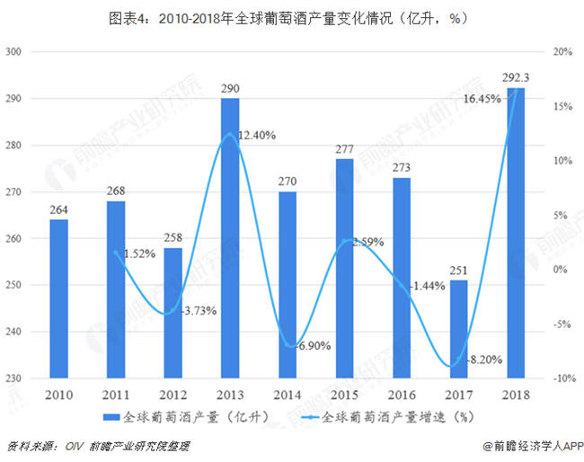放眼世界,2019年4月國際葡萄酒權威機構OIV(國際葡萄與葡萄酒組織)發布了2018年全球葡萄酒的有關數據。數據顯示,2018年全球葡萄酒(不包括葡萄汁和酒醪)產量達到292.3億升,創15年來最高值。相對于2017年的251億升,產量增加了41.3億升。由于惡劣天氣的原因,2017年全球葡萄酒產量下降8.2%,是近50年來最低值。