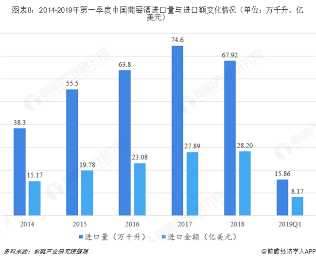 2019年1-3月,中國累計進口葡萄酒15.86萬千升,同比下降24.3%;金額為8.17億元,同比下降15.8%。