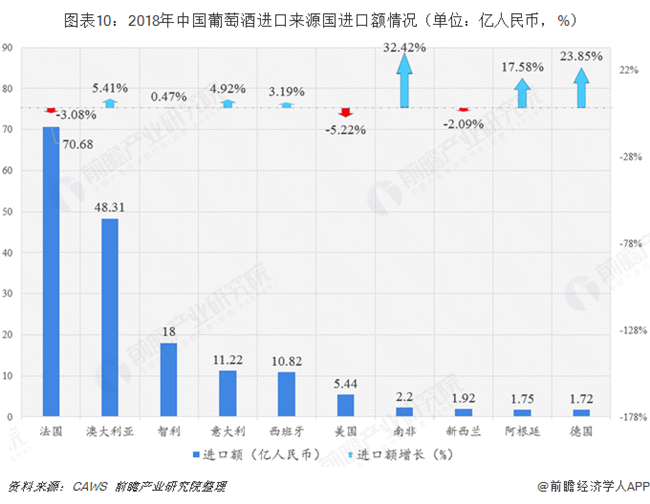 根據中國葡萄酒及烈酒進出口協會(CAWS)發布的2018年中國進口葡萄酒數據報告,2018年法國、澳大利亞和智利為我國葡萄酒三大進口來源國。其中法國葡萄酒進口量達1.74億升,同比下降21.06%;進口金額70.68億人民幣,同比下降3.08%。盡管法國進口量和進口額均較上年有所下降,與第二名澳大利亞的差距逐漸縮小,但其在中國進口葡萄酒市場上的地位依舊排名第一。