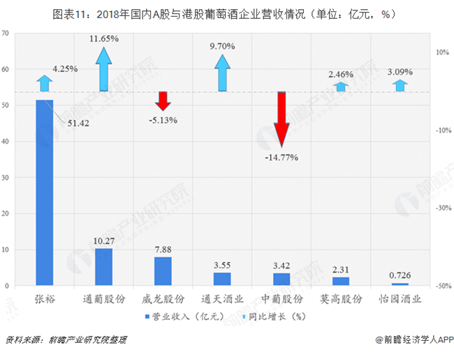 2018年七家葡萄酒企業的營業收入總和達到近80億元,其中只有威龍股份和中葡股份兩家企業營收出現下跌。張裕在2018年實現營收51.42億元,同比增長4.25%,行業龍頭位置穩固;通葡股份營收增速最高,達11.65%,營收10.27億元達到上市以來新高;中葡股份下滑幅度最大,2018年營收實現3.42億元,同比下滑14.77%,連續兩年虧損的中葡股份股票實施退市風險,股票簡稱由“中葡股份”變為“*ST中葡”。