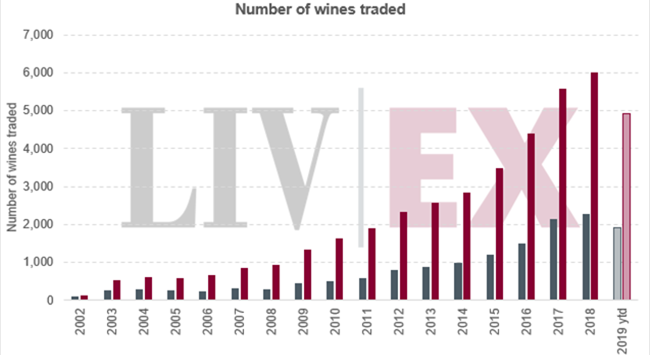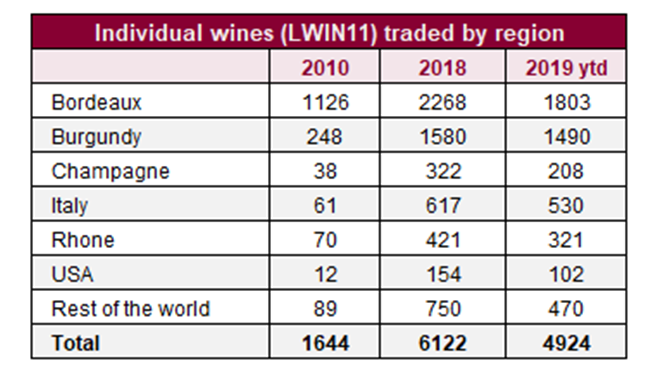 本年至今,已有4924款不同的葡萄酒(包括不同年份)出現交易。它們來自多個不同酒區,包括英國、中國和黎巴嫩;盡管這些國家的交易數量不多。