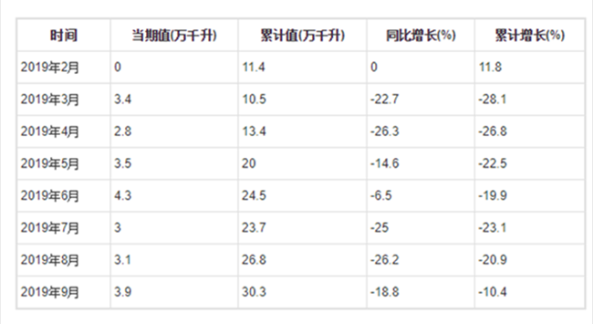 2019年9月全國葡萄酒產量為3.9萬千升,累計值為30.3萬千升,同比下降18.8%,累計下降10.4%。