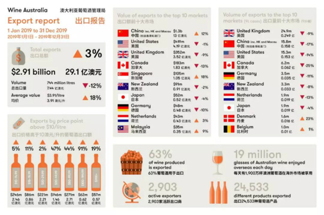 澳大利亞葡萄酒協(xié)會(huì)(Wine Australia)今天上午發(fā)布的數(shù)據(jù)顯示,在截至2019年12月的12個(gè)月里,澳大利亞葡萄酒出口總額增長了3%,達(dá)到29.1億美元。
