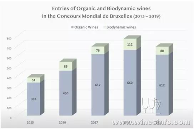 有機(jī)葡萄酒和生物動力法葡萄酒的參賽酒款數(shù)量(2015年至2019年)