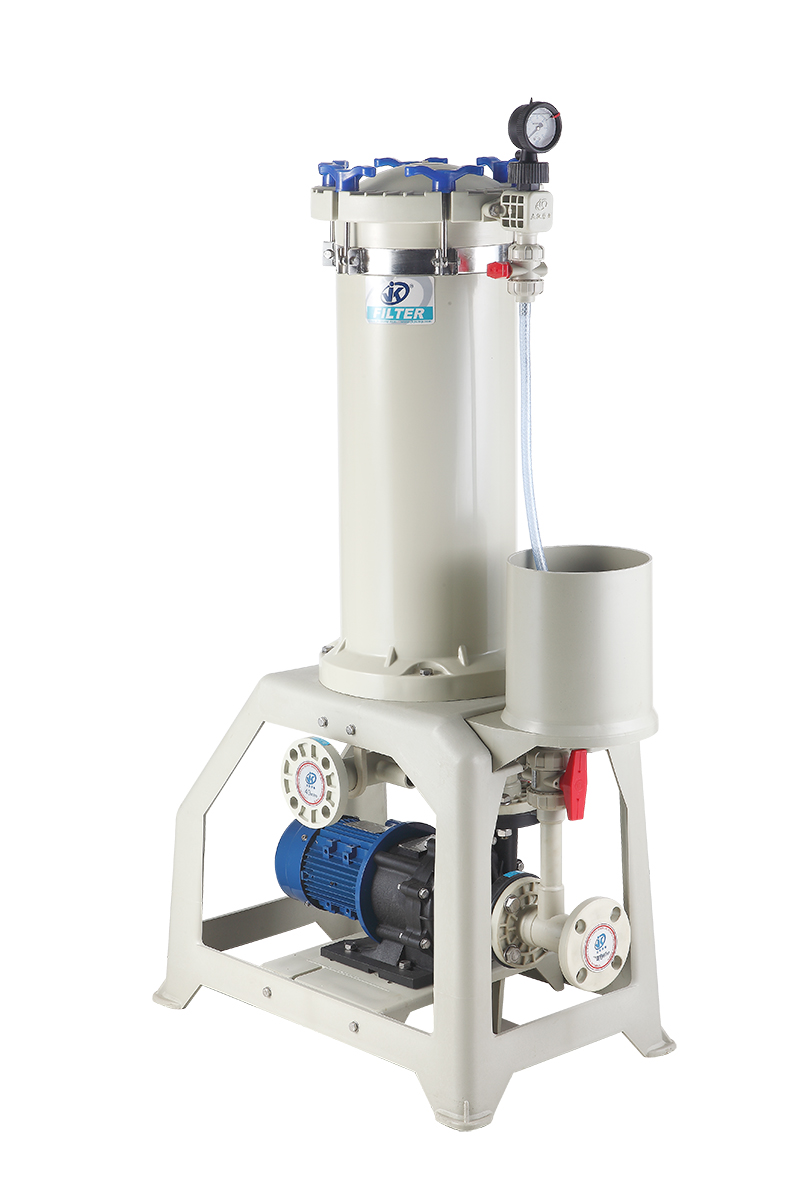 過濾層次而言,有單桶和雙桶之分;就濾板材質(zhì)不一,有PVC,FRPP,PVDF,之分;但不論何種過濾機(jī),其工作原理首先是加壓過濾,濾芯與濾桶形成濾室,過濾藥液在強(qiáng)大的壓力下送入濾室,進(jìn)入濾室的過濾藥液其固體部分被過濾棉芯(濾布)截留在濾芯上,液體部分透過過濾棉芯(濾布)而排出濾室,從而達(dá)到固液分離的目的,隨著壓力的增大,固液分離則更徹底,但從能源和成本方面考慮,過高的加壓不劃算。