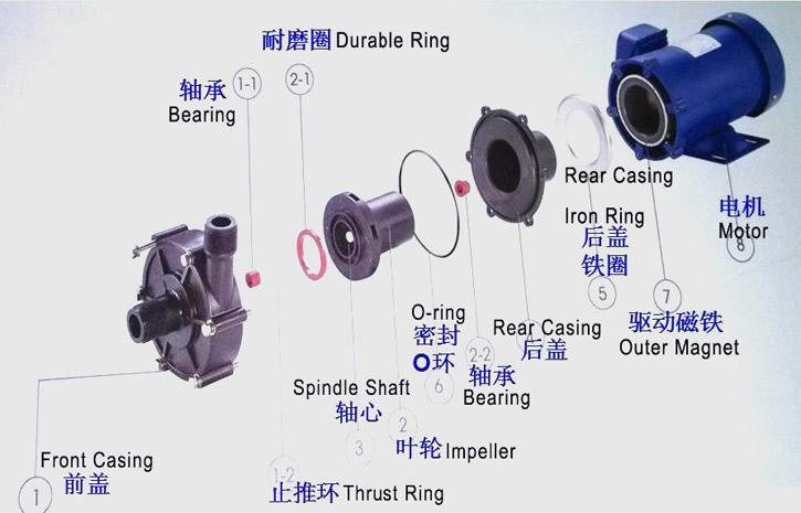 旋轉(zhuǎn),實現(xiàn)動力的無接觸傳遞。由於泵軸、內(nèi)磁轉(zhuǎn)子被泵體、隔離套完全封閉,動密封轉(zhuǎn)化為靜密